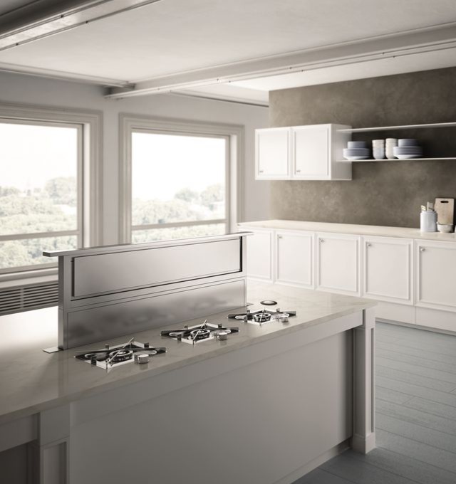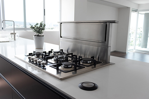 La campana extractora retráctil se puede ocultar dentro de la superficie de la cubierta cuando no está en uso, dejando una vista abierta de su cocina.